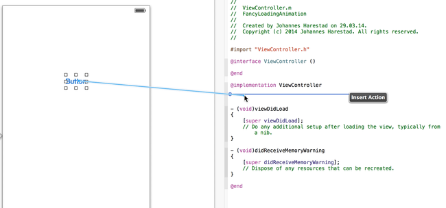 Go back to ViewController.m and implement the action for when you press the button you created in the Storyboard. Remember to import “LoadingAnimationView.h”.